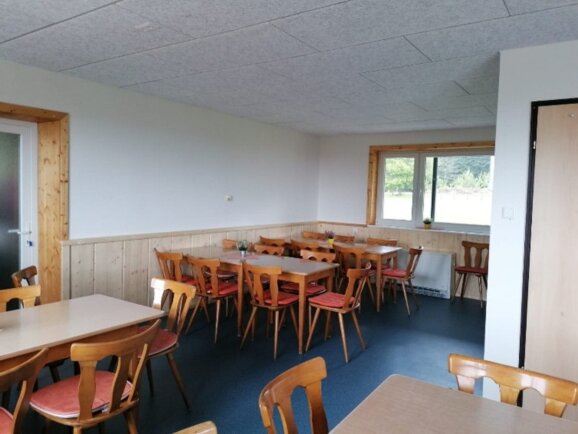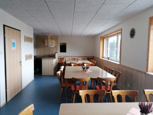 Der Gastraum des Sportheims ist 2025 komplett neu renoviert worden und bietet Sitzplätze für ca. 50 Personen. Die Küche ist vollausgestattet.